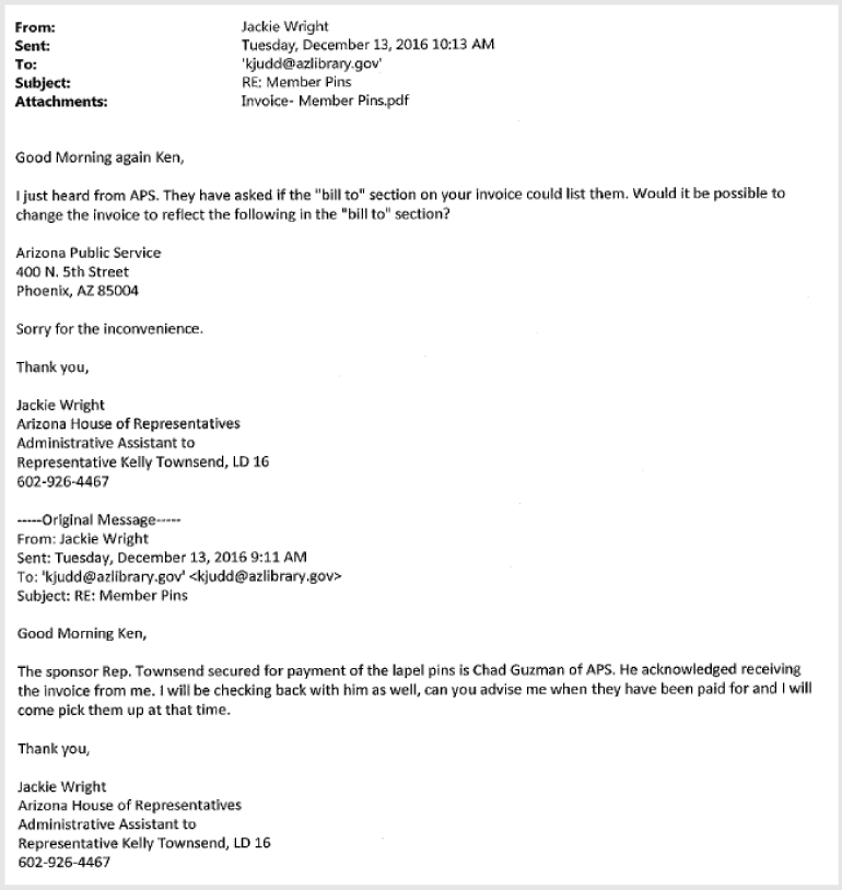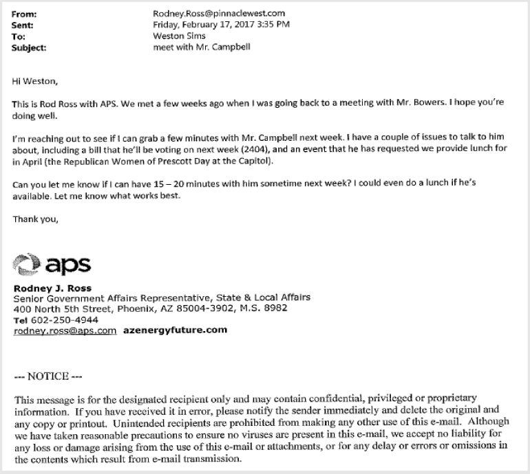 Despite the Burns’ lawsuit, APS and Pinnacle West haven’t seemed shy about giving ratepayers’ money to legislators to various and sundry items including re-election campaigns. In fact emails show that the state’s lawmakers regularly turn to the companies for financial assistance.