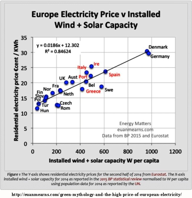 Here is what is happening in Europe. The more installed solar and wind capacity per capita a country has, the higher the price people pay for electricity. In the graph below the vertical scale is Euro cents per kilowatt-hour, the horizontal scale is the installed capacity of renewables (solar and wind) per capita. (For reference, the U.S. average residential cost is 12 cents/kwh which is about 9.6 euro cents/kwh, lower than all European countries on the graph.)