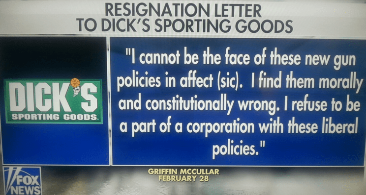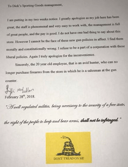 Another twenty year old Millennial Griffin McCullar , who lives in North Carolina reacted to the Dick’s Sporting Goods decision on February 28, 2018 giving them two weeks notice of his resignation as a result of this announcement.