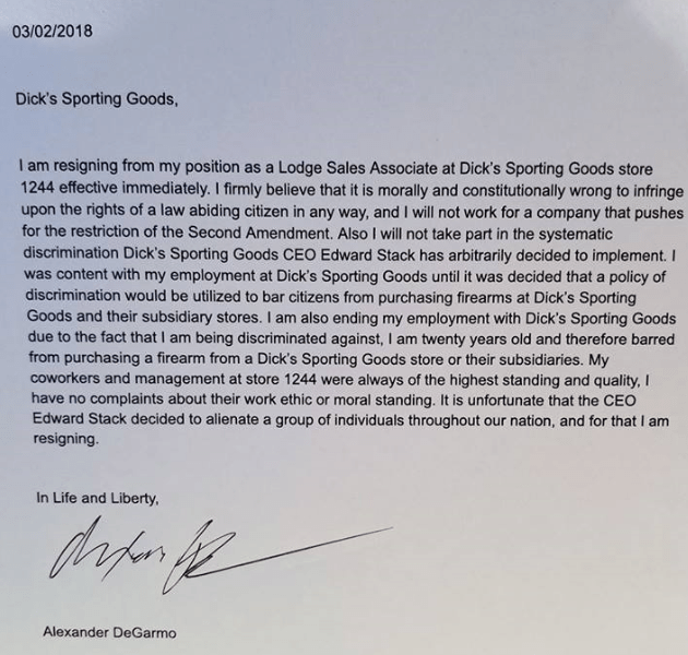 On Friday March 2, 2018 Alexander DeGarmo notified the Lincoln, Nebraska Dick’s Sporting Goods store of his resignation and posted a scathing resignation letter on Facebook(below) hammering his former employer and its CEO, Edward Stack.