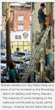 Bisbee resident Jon Sky helps hang up a piece of art he donated to the Broadway Stairs Art Gallery with Kenny Stewart. The majority of works hanging on the walls are contributed by locals. Jamie Verwys / Arizona Sonora News Service