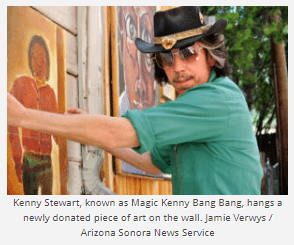 Kenny Stewart, known as Magic Kenny Bang Bang, hangs a newly donated piece of art on the wall. Jamie Verwys / Arizona Sonora News Service