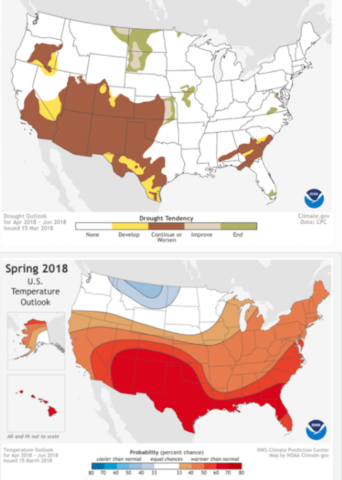 A March report by the National Oceanic and Atmospheric Administration predicts increased temperatures and drought for Arizona and other southwestern states in spring 2018. Increased spring and summer temperatures and decreased spring precipitation are the climate variables most likely to increase annual area burned in Arizona, according to Falk. (Graphic by: NOAA)