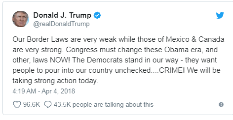 Our Border Laws are very weak while those of Mexico & Canada are very strong. Congress must change these Obama era, and other, laws NOW! The Democrats stand in our way – they want people to pour into our country unchecked….CRIME! We will be taking strong action today.