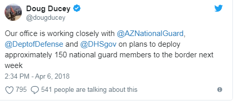 Ducey is the first of four border governors to respond to Trump’s request to use the National Guard to support the work of U.S. Customs and Border Protection agents. Texas Gov. Greg Abbott has voiced support for the deployment, but the governors of California and New Mexico have not commented publicly.