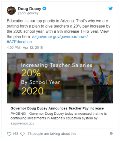On Thursday, Governor Doug Ducey announced a plan to give teachers across the board a permanent 9 percent pay increase this year, with a 20 percent total increase by 2020.