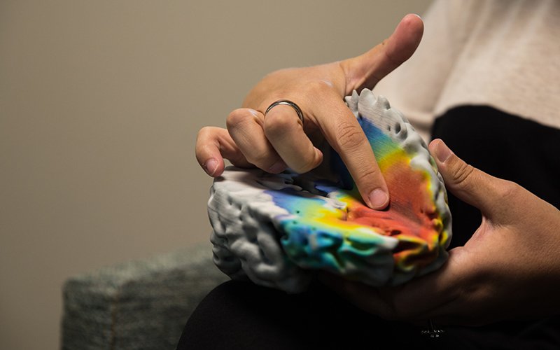 Dr. Kristin Swanson points at a glioblastoma (dark red) within a brain model. The mathematical neurology lab at the Mayo Clinic-Arizona works to determine not only where the brain tumor is, but to identify areas where cancer cells have spread (indicated by all other colors). (Photo by Melina Zuniga/Cronkite News)