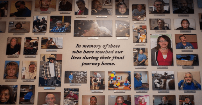 Some patients die during their stay. Pictures of deceased patients line a chapel wall at the center.