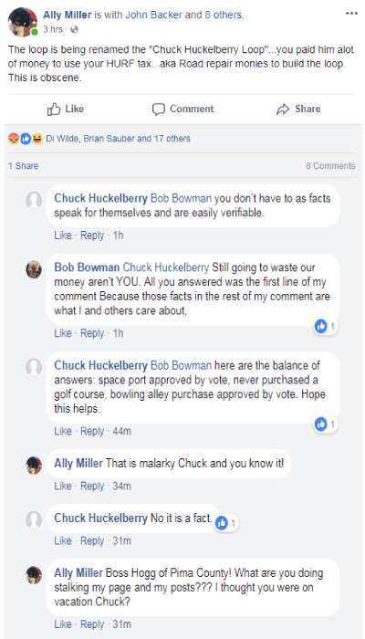 “On Tuesday night, Mr. Huckelberry showed up on my Facebook page. He is getting very aggressive and his stalking-like behavior is disconcerting. I find it really disturbing that my constituents cannot communicate with me on my personal Facebook page without being stalked and investigated by Chuck Huckelberry,” Miller told the ADI.