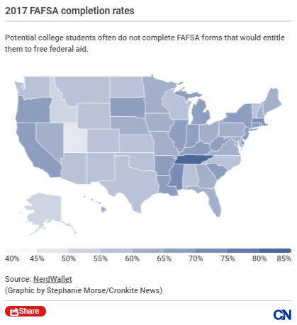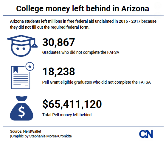 Arizona students left more than $65 million in free federal aid unclaimed last school year because they did not fill out the required federal form, according to a 2017 NerdWallet report.