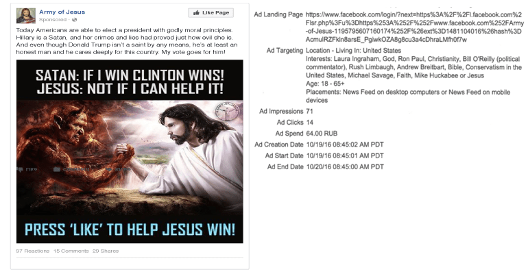 Did These Russian Social Media Ads Influence Your Vote? [POLL] May 27, 2018 John Hunnicutt “Clinton Satan Jesus” Russian ad 1 2 3 4 5 6 7 8 9 10 11 12 13 14 15 16 17 18 19 20
