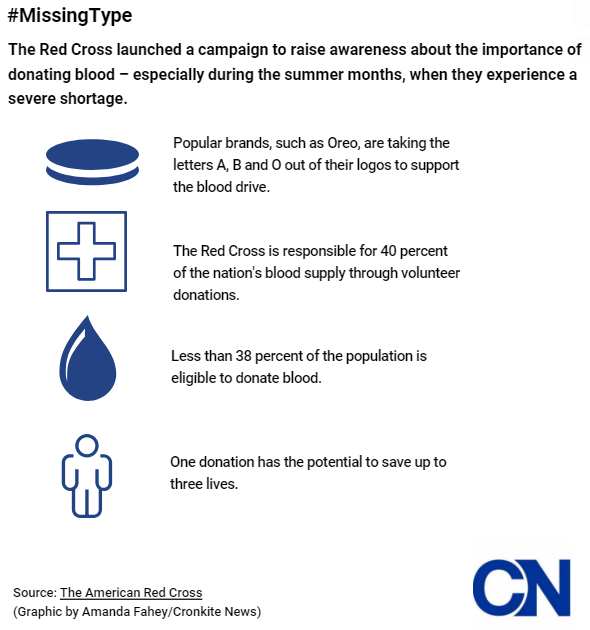 The American Red Cross on Monday kicked off its #MissingType campaign to raise awareness of the shortages of A, B and O blood types across the country, and to encourage donations during the traditionally slow summer.