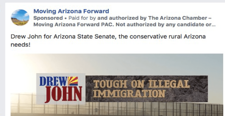 Fast forward to this year and the same LD14 has an open Senate seat. Conservative former House Speaker David Gowan is running, but he’s “a Trump guy” who founded the House Liberty Caucus when he first got elected. He’s an original Tea Party kind of legislator and that’s not good news for the establishment. So they recruit Drew John to run and its back to the same playbook where Drew John acts conservative and talks about the border, while outside groups spend tens of thousands of dollars to promote John to the Senate. Think John McCain or Jeff Flake at the federal level and you’ve got Drew John at the state level. Drew John campaigns on standing up to the special interests, while those same special interest groups spend a fortune to get him elected.
