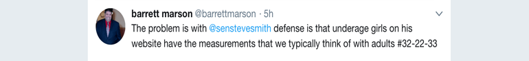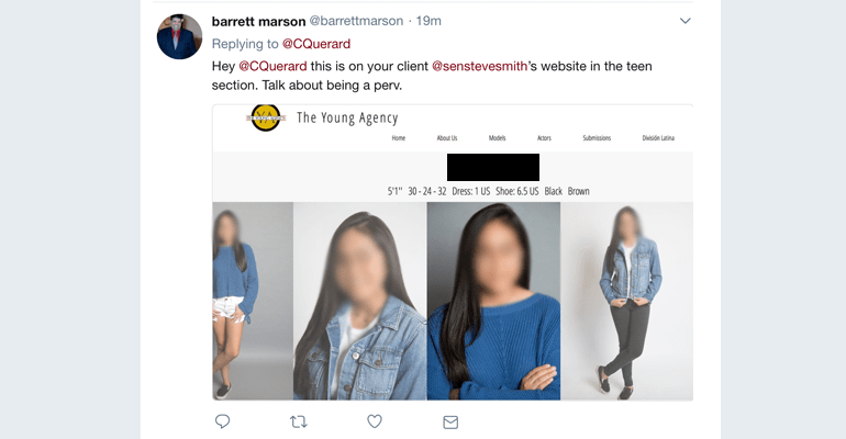Rogers has essentially been claiming that the Christian-based modeling agency that Steve Smith works with, which helps kids and adults find modeling jobs in and print ads and TV commercials and those sorts of things, is somehow connected to human trafficking, prostitution, and really ugly things. Because they work with both adults and kids, Rogers tried to claim that Smith’s business targeted “underage” girls, in an effort to try to make it seem sordid or illegal. So the spokesperson for Tiffany Shedd tried to repeat these charges and made several tweets that frankly are just really disturbing.