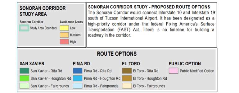 The late Senator John McCain, with bipartisan support from Arizona legislators, amended the 2015 FAST Act, a transportation bill, to designate the Sonoran Corridor as high-priority. No funding was provided, however, and there is no public timeline for actual construction. Decisions made by the EIS Study, however, will be the model when money does become available.