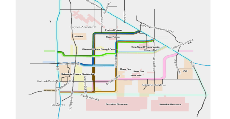 The Arizona Dept. of Transportation/Federal Highway Administration (ADOT/FHWA) map of potential Sonoran Corridor routes was unveiled at a public meeting of about 100 people held September 26 at the Desert Diamond Casino.