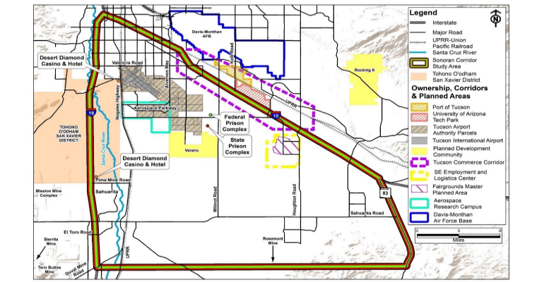South Wilmot Land Investors, organized and staffed by Diamond Ventures, drafted its Specific Plan for Swan Southlands in 2005 with amendments in 2010. The 3200 acre development notes that, “There are regional plans to develop an Aerospace, Defense, High Tech and Manufacturing Business Park in the southeast area. This was initiated with the development of the Aerospace Parkway to serve Raytheon and the Tucson International Airport. The alignment of a future regional transportation corridor connecting I-19 to I-10 is also planned.” That was written at least ten years before the ADOT/FHWA study began, and four years before the Pima County Administrator went public with his plan.
