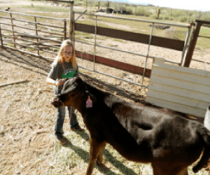 Dust swirls around Addison’s square-toed boots as she leads a calf the color of chocolate syrup out of the stall and into her backyard. Despite being three times her size, the animal follows patiently behind Addison like a dog on a leash.