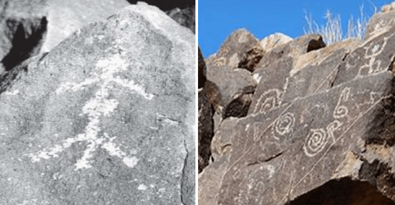 A common motif in the Sonoran Desert are stick figures with a long middle “leg.” Male archaeologists have called it “male bragging,” but then there are similar figures with large bellies. So, pregnant men? Or could these be the recording of births, which could explain why they are so widespread and clearly not the work of any one individual. If so, then that is a form of written history. (L. near Cocoroque Butte; R. Signal Hill)