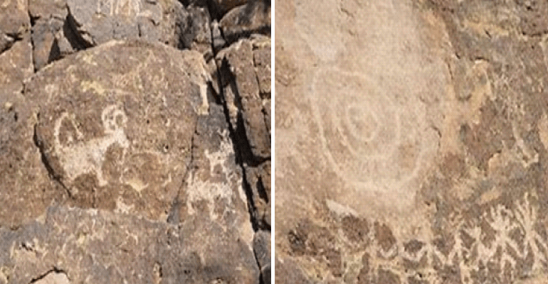 Signal Hill ‘glyphs include bighorn sheep, and representations of a flower-based spirituality that came up from southern Mexico. Signal Hill was likely a gathering place for religious rituals. Spiral solstice and equinox markers were the seasonal calendar necessary for agricultural people; on the day the seasons shifted a shadow cast by another carefully-placed rock would split the spiral directly down the center.