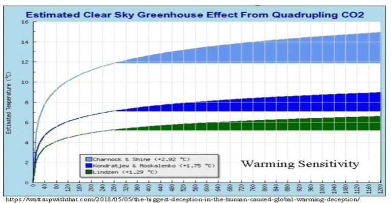 In the graph, the numbers shown in parentheses are the estimated temperature increase from quadrupling carbon dioxide concentration. Many climate models use much higher values for the sensitivity. That’s why most climate models run much hotter than measured temperatures.
