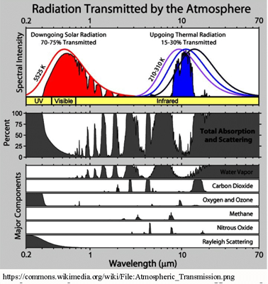 We begin with a very simplified review of what the greenhouse effect is. Solar radiation, mostly short-wave radiation, passes through the atmosphere and warms the surface. In turn, the heated surface re-radiates energy as long-wave infrared radiation back to the atmosphere and eventually, back to space.