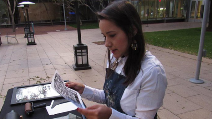 PHOENIX – Artist Diana Calderon used a small brayer to spread dark ink on a glass plate as she demonstrated how to make a print from a linocut.