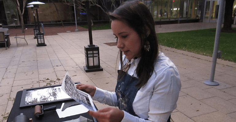 Diana Calderon looks over a proof she made from a linoleum carving inspired by a 2016 trip to Teotihuaca, a Mesoamerican city in the broad Valley of Mexico. (Photo by Matthew Casey/KJZZ)