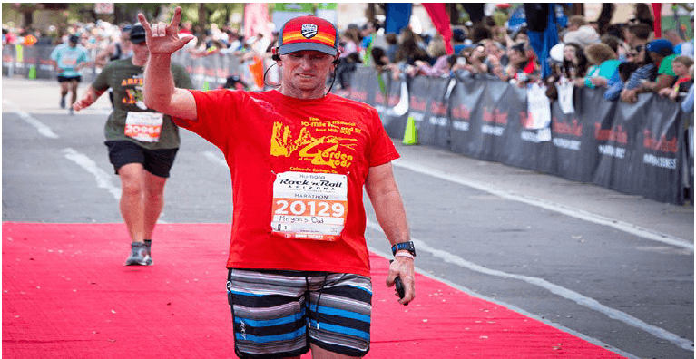 Neal Oseland, running across the finish line with the words “Megan’s Dad” on his bib, was motivated to run the Rock ’n’ Roll Arizona Marathon because of his daughter’s perseverance after suffering a stroke. (Photo by Josh Shure/Cronkite News)
