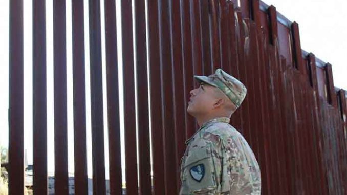 Sgt. Fabian Barreto, 104th Engineer Construction Company, surveys the border wall along the Arizona-Mexico border in November as part of the Pentagon's support of border-security operations. The Defense Department said it is sending 3,750 more troops to the border in the effort. (Photo by 2nd Lt. Corey Maisch/U.S. Army)