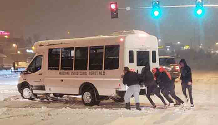 The Alchesay High School girls basketball team pushes its bus through a snowy intersection in Prescott. (Photo courtesy Lee Patterson)
