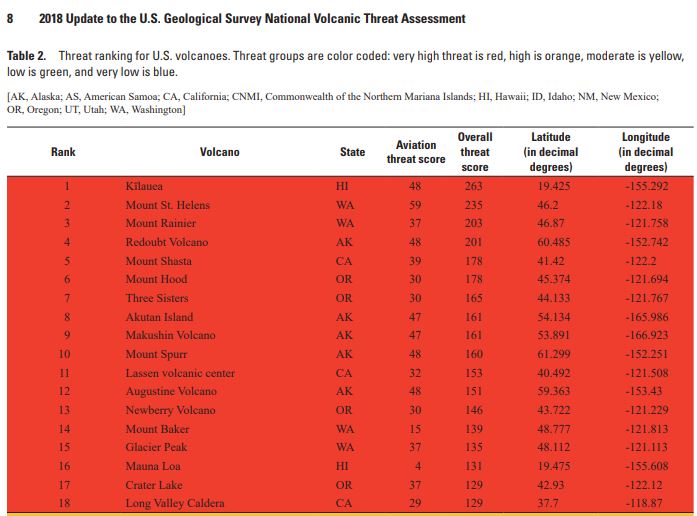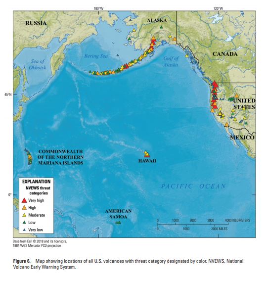The US Geological Survey (USGS) has updated its assessment of volcanic hazard threats in the United States. Most volcanoes occur along the Pacific coast of the U.S., within the Aleutian Islands of Alaska, and on certain other Pacific islands such as Hawaii. The USGS lists 161 volcanoes as dangerous, of which, 18 are considered to have a “very high” threat for damage.