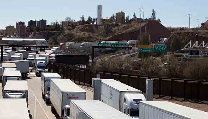 Trucks from Mexico line up to enter Arizona through the Mariposa Cargo Facility in Nogales. CBP officers at this port found nearly 650 pounds of fentanyl and methamphetamine hidden in a cucumber truck late last month. (Photo by Nicole Ludden/Cronkite News)