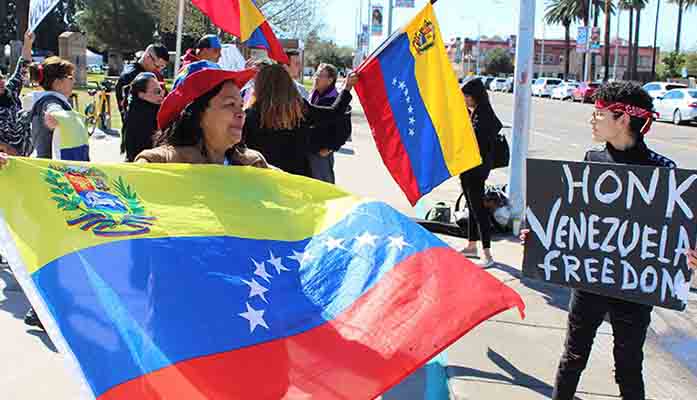 Maura Tovar waves a Venezuelan flag as Vanessa Centorami holds a hand-painted sign to solicit support from passing drivers. (Photo by Nicole Ludden/Cronkite News)