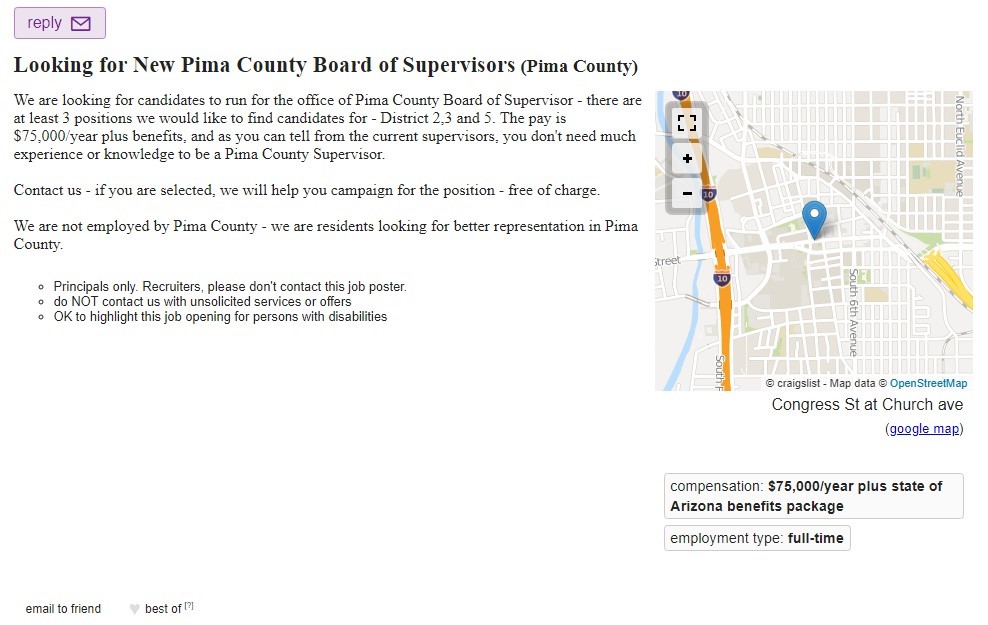 Pima County residents are reaching a new level of disgust with the Pima County Board of Supervisors. A Craigslist ad has been posted looking for candidates to run against the current BOS members in districts 2, 3, and 5. However, with Steve Christy’s recent support of mortgaging county property to build millions of dollars of roads for wealthy businessman Don Diamond, some might want district 4 added to the list.