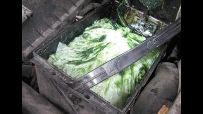After the woman was referred for additional inspection, a narcotics detection K-9 alerted to a scent from under the hood of her Toyota sedan. A search led to the discovery of packages that were inside of the vehicle’s battery.