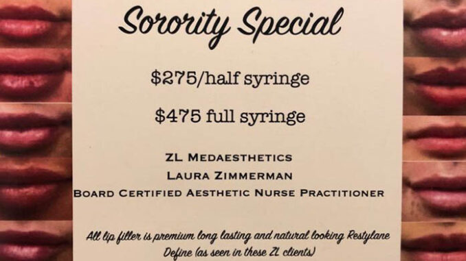 Zimmerman targeted her audience by walking door to door to sorority houses during their chapter meetings. The Sorority Special includes a $25 discount on lip injections. There are about 37 cosmetic clinics in Tucson, but Zimmerman has been especially aggressive in looking to sororities. The University of Arizona has chapters of 24 national sororities and womens fraternities.