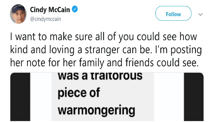 cintwee Mrs. McCain may have inadvertently started a new and uglier chapter in the war between President Trump and the McCain family.