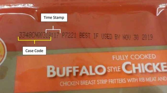 ● 20-lb. cases of frozen “SPARE TIME FULLY COOKED, BUFFALO STYLE CHICKEN STRIPS CHICKEN BREAST STRIP FRITTERS WITH RIB MEAT AND BUFFALO STYLE SAUCE” with “BEST IF USED BY NOV 30 2019,” and case code 3348CNQ03.