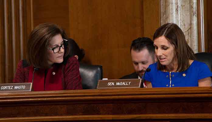 Sen. Catherine Cortez-Masto, D-Nevada, left, and Sen. Martha McSally, R-Arizona, pledged to witnesses at the Senate subcommittee hearing that they would move quickly to push legislation enabling the Drought Contingency Plan for the Colorado River states. (Photo by Andrew Howard/Cronkite News)