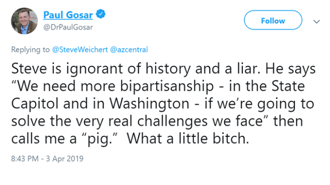 In response, Gosar tweeted back, “Steve is ignorant of history and a liar. He says “We need more bipartisanship – in the State Capitol and in Washington – if we’re going to solve the very real challenges we face” then calls me a “pig.” What a little bitch.”