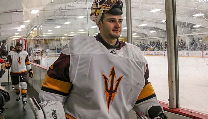 nhl Joey Daccord had a strong season in goal for ASU, making a stop here in an early season contest against No. 1 Ohio State. (Photo by John Mendoza/Cronkite News)