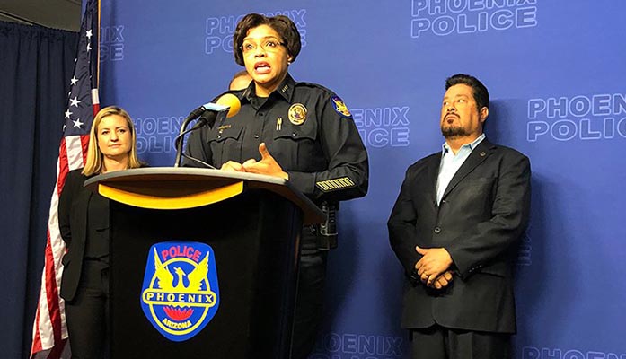 Police Chief Jeri Williams, flanked by Mayor Kate Gallego and Councilman Michael Nowakowski, says the department wants to work more closely with behavioral health and crisis-response organizations. “A tangible example could be and include the mental health professionals riding side-by-side in a car with a patrol officer or crisis intervention team squad.” (Photo by Hailey Mensik/Cronkite News)