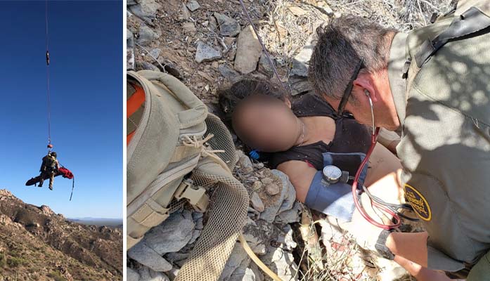 Arizona Department of Public Safety dispatched a helicopter to the scene where the EMT resorted to using a rope and carabineer system to prevent the woman from sliding further down the hillside, stabilizing her position while administering intravenous fluids.