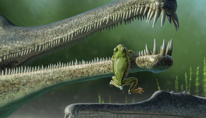 This is an artist’s rendition of what a Triassic frog may have looked like. Paleontologists last May discovered a tiny pelvic bone from a frog dating to this time period. They plan to return to Petrified Forest National Park in June to search for more such fossils. (Image courtesy of Andrey Atuchin)