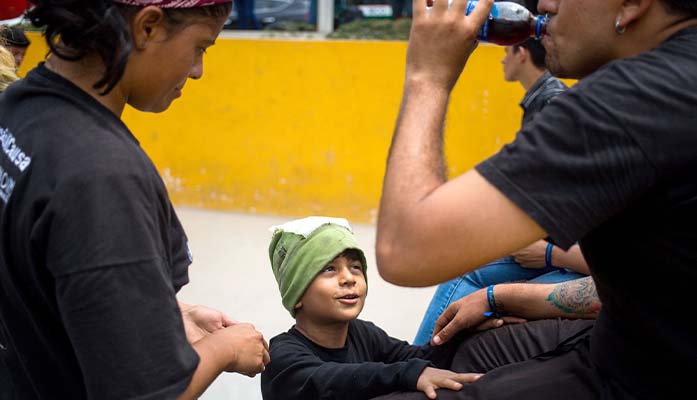 Christopher Diaz looks up to his father and mother as they take a break during rehearsals of the hip-hop troupe Inject Kulture in a Lima park. (Photo by Nicole Neri/Cronkite Borderlands Project)
