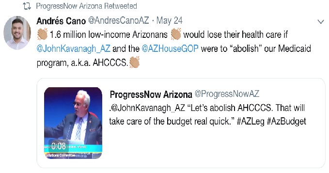 Kavanagh responded by posting the entire clip but the several thousand people who follow ProgressNow will never see the truth because ProgressNow refused to share it. Trying to feed the hysteria, State Representative Andres Cano tweeted the lie and claimed the entire Republican House Caucus was in on it, which of course ProgressNow Arizona retweeted to further reinforce the made up story.