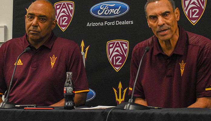 Marvin Lewis (left) and Herm Edwards will enter this season with a total of 57 years of coaching experience. Lewis, who was fired by the Cincinnati Bengals in December after three straight losing seasons, has been hired as a special adviser to ASU football. (Photo by Brady Vernon/Cronkite News)
