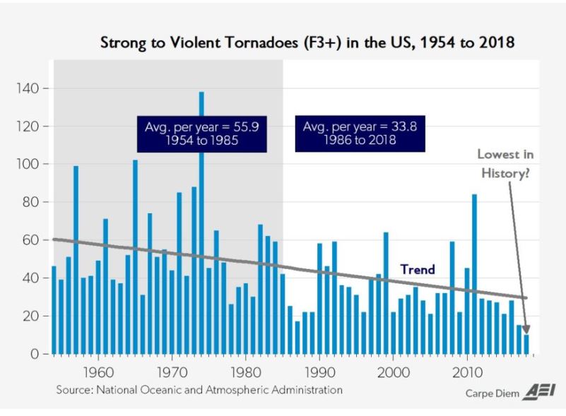 This year, the Northern Plains have been averaging 5-10 deg. F below normal due to cold air masses stretching from Michigan, through Colorado to California. It’s weather, not global warming. As Dr. Spencer notes, the number of strong to violent U.S. tornadoes has gone down from 60 in 1954 to 30 in 2018.