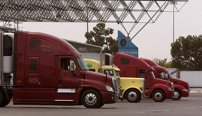 Trucks wait to enter the U.S. from Mexico at the Otay Mesa, Calif., Port of Entry. Mexico exported $346 billion in goods to the U.S. last year – $9 billion to Arizona – that would be subject to the president’s proposed tariffs. (Photo by Glenn Fawcett/U.S. Customs and Border Protection)
